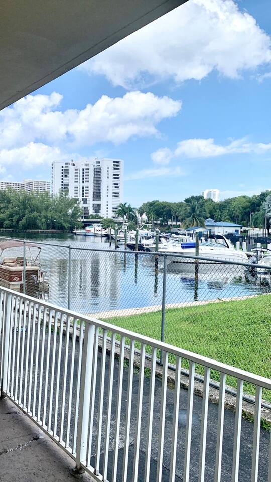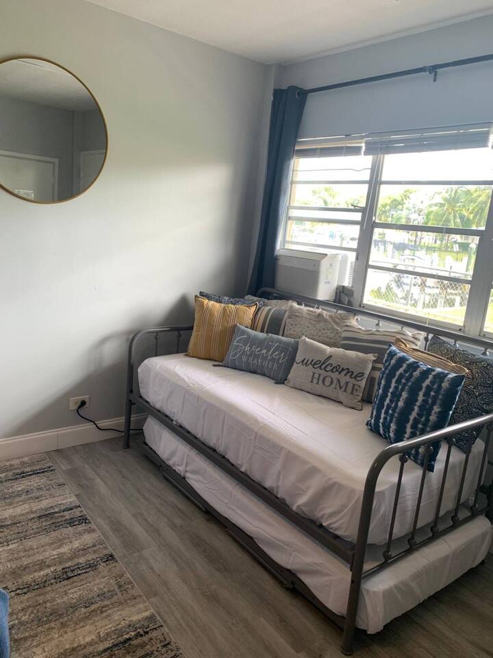 Discover your ideal vacation in this bright, pet-friendly South Florida studio with a beautiful waterway view. Perfectly positioned just a 10-minute walk from the beach, this cozy space is your home base for exploring nearby restaurants, shops, and casinos. The studio is well-equipped with a queen bed, day bed, extra mattress, kitchenette, high-speed Wi-Fi, AC, on-site laundry, and FREEVparking. We also provide beach chairs and towels for your convenience.